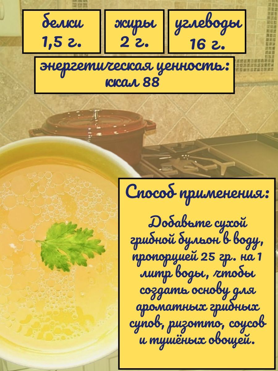 Универсальность применения – подходит для грибных супов, ризотто, соусов, тушёных овощей и постных блюд.