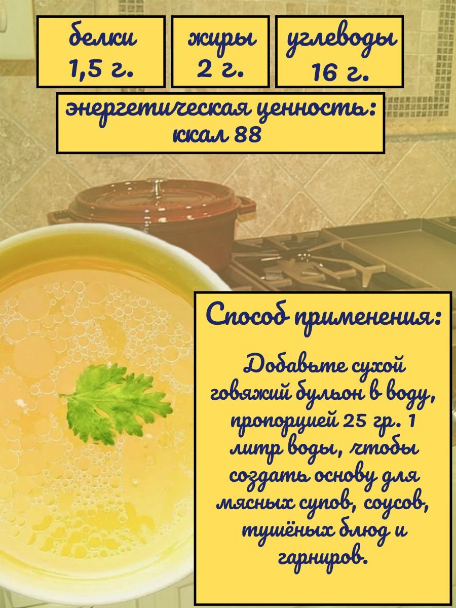Универсальность применения – подходит для борщей, рагу, мясных подлив, тушёных овощей и маринадов. Легкость приготовления – быстро растворяется, создавая насыщенный бульон без долгой варки.