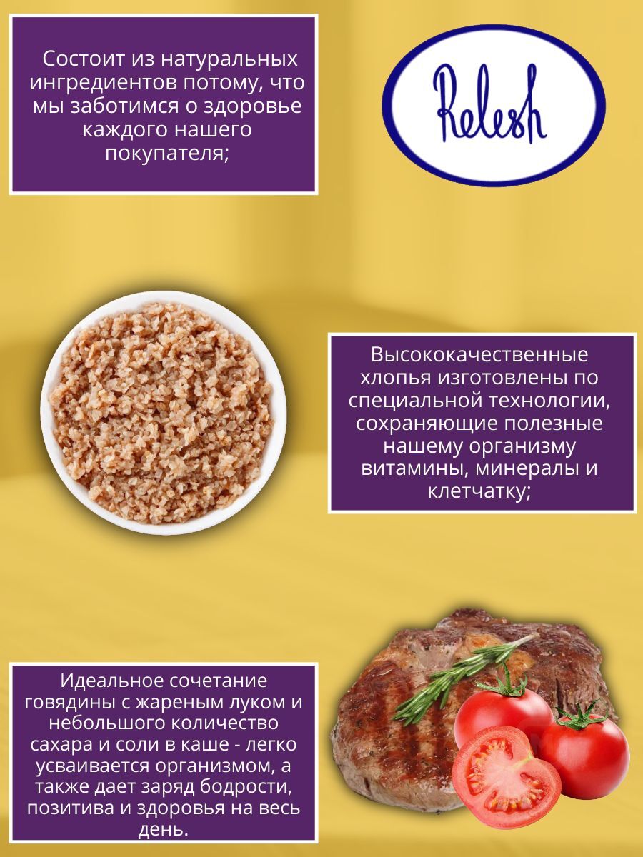 Когда хочется настоящей еды — выбирайте гречневую кашу Relish с говядиной и копчёными томатами. Вкусно, сытно и... готово за 3 минуты — без варки, без кастрюль. Просто заливаете кипятком и через пару минут наслаждаетесь ароматной кашей из натуральной гречки с сочными кусочками сушёной говядины и дымком копчёных томатов.