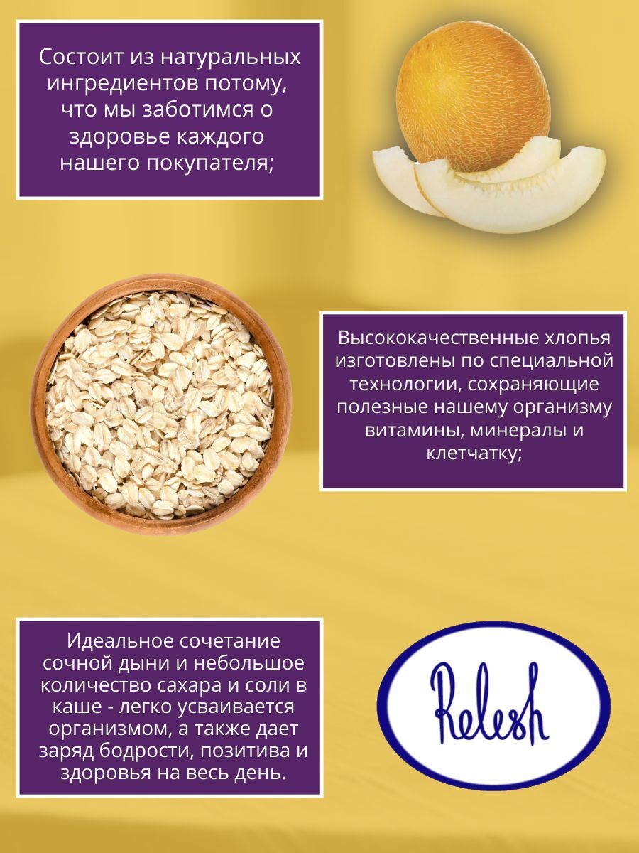 Попробуйте овсяную кашу с ароматом сочной дыни и откройте для себя новый уровень удобства и удовольствия от еды. Это идеальный выбор для тех, кто ценит свое время и здоровье. С кашами Relish вы всегда будете готовы к новым приключениям!