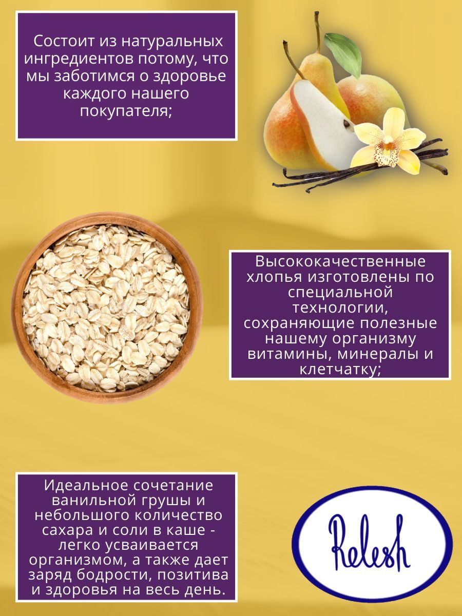 Овсяная каша быстрого приготовления в пакетиках Relish “Ванильная груша” — это быстрый завтрак без варки с мягким вкусом груши и ароматом ванили. В каждом порционном пакетике — 35 г овсяных хлопьев с натуральными ингредиентами. Просто залейте кипятком — и через 3 минуты готова вкусная и полезная еда быстрого приготовления.