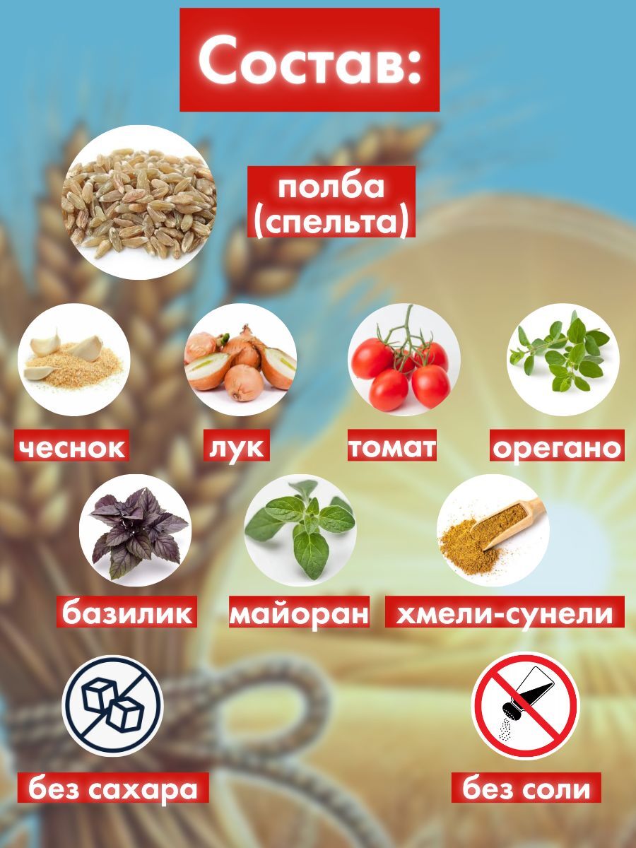 Полба (спельта), чеснок, лук, томат, орегано, базилик, майоран хмели-сунели.