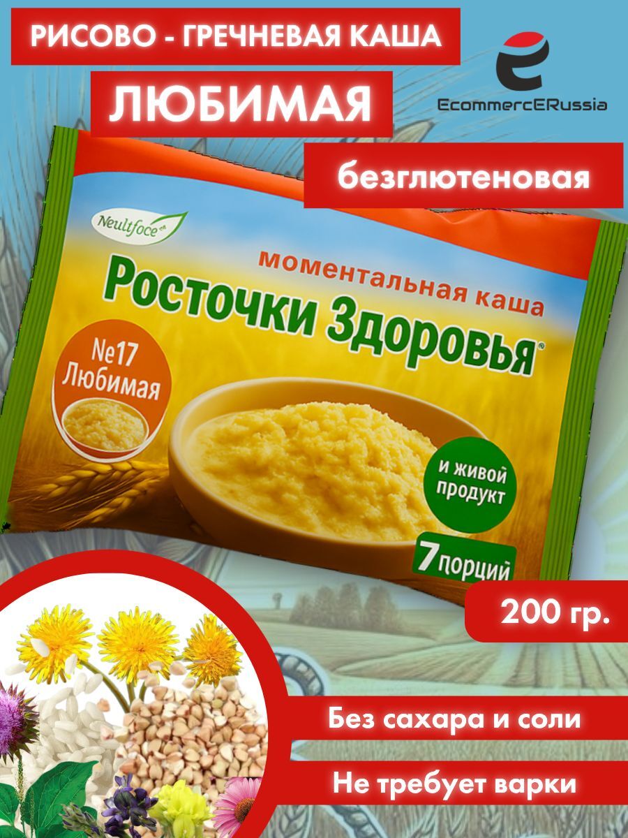 Каша быстрого приготовления «Любимая» от бренда «Росточки здоровья» — натуральный фитопродукт на основе риса, гречки и целебных трав: расторопши, эхинацеи, подорожника, люцерны и корня одуванчика.