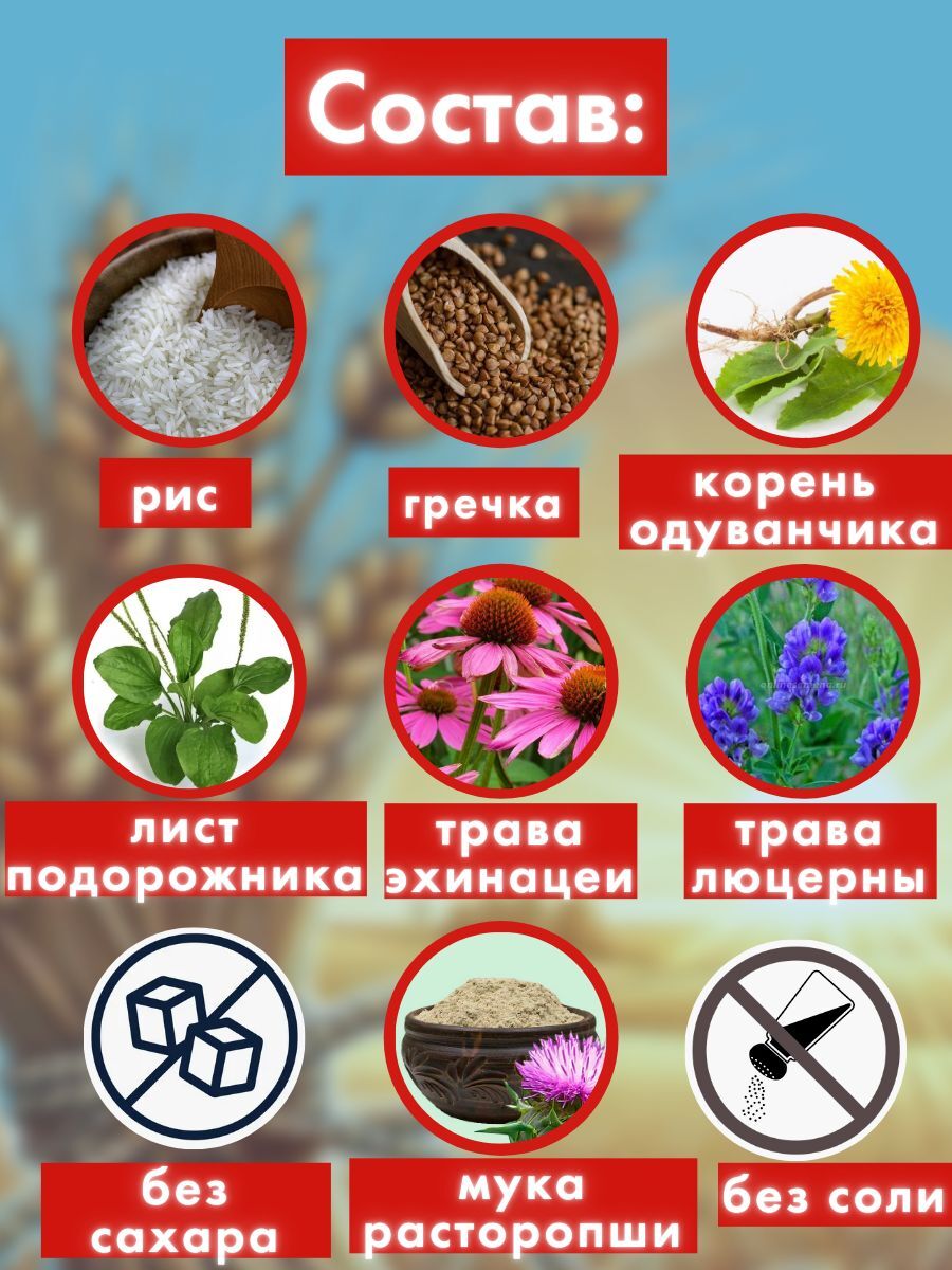 Рис, гречка, корень одуванчика, лист подорожника, трава эхинацеи, трава люцерны, мука расторопши.