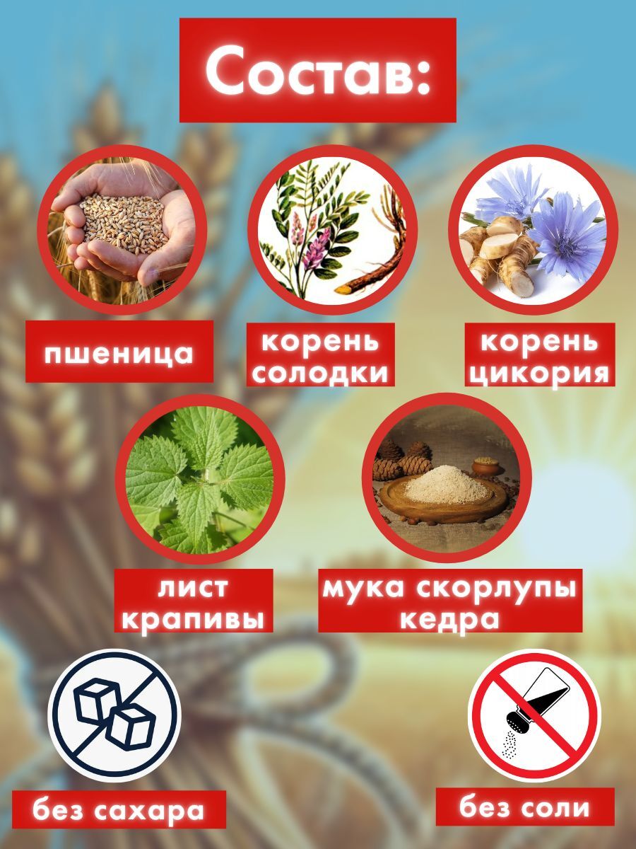 Пшеница, корень солодки, корень цикория, лист крапивы, мука скорлупа кедра