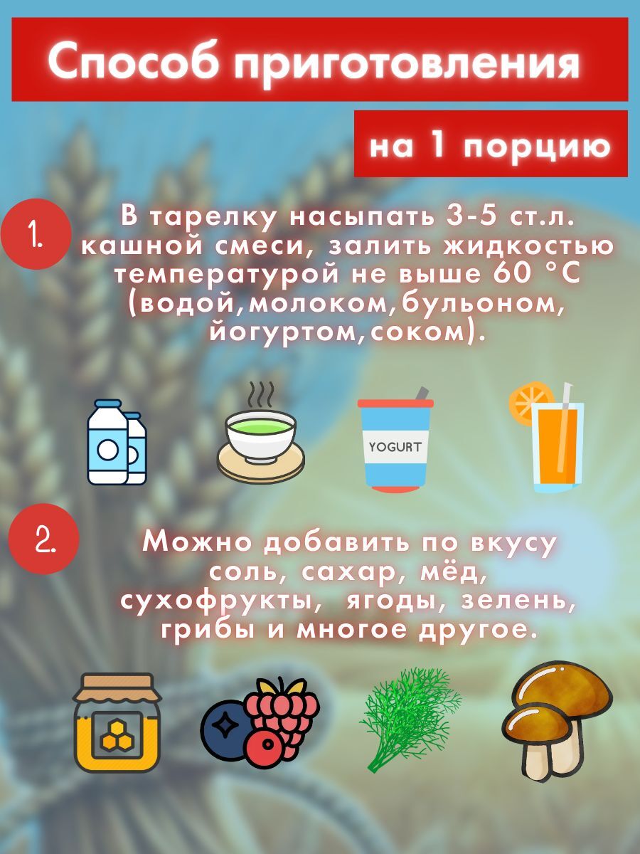 Не содержит глютен, сахар, ГМО, искусственные ароматизаторы и красители. Подходит для диетического, постного и вегетарианского питания. Просто залейте водой, молоком или йогуртом — и через 3–5 минут насладитесь функциональной кашей с травами.