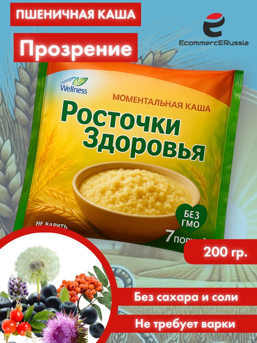 Каша быстрого приготовления «Прозрение» от бренда «Росточки здоровья» — это натуральный фитопродукт на основе цельной пшеницы и ягодно-травяного комплекса: черники, шиповника, рябины и расторопши.