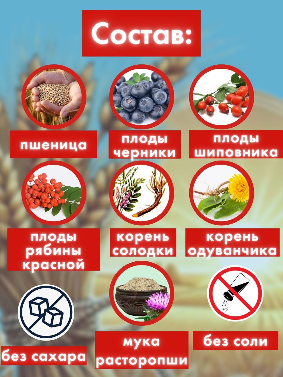 Пшеница, плоды черники, плоды шиповника, плоды рябины красной, корень солодки, корень одуванчика, мука расторопши