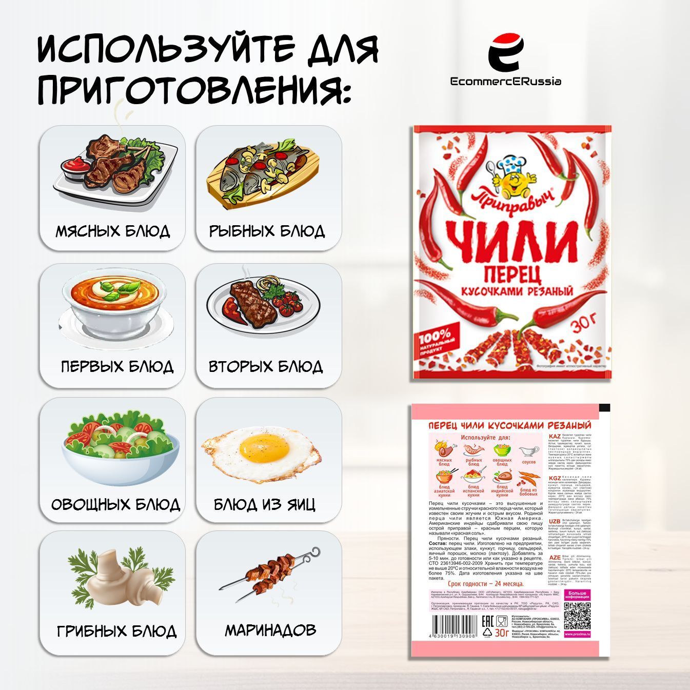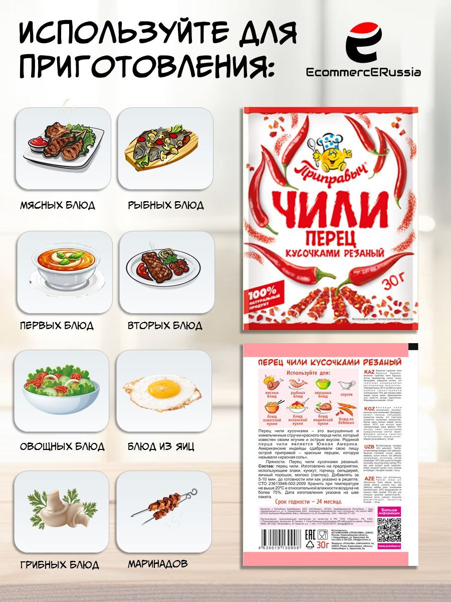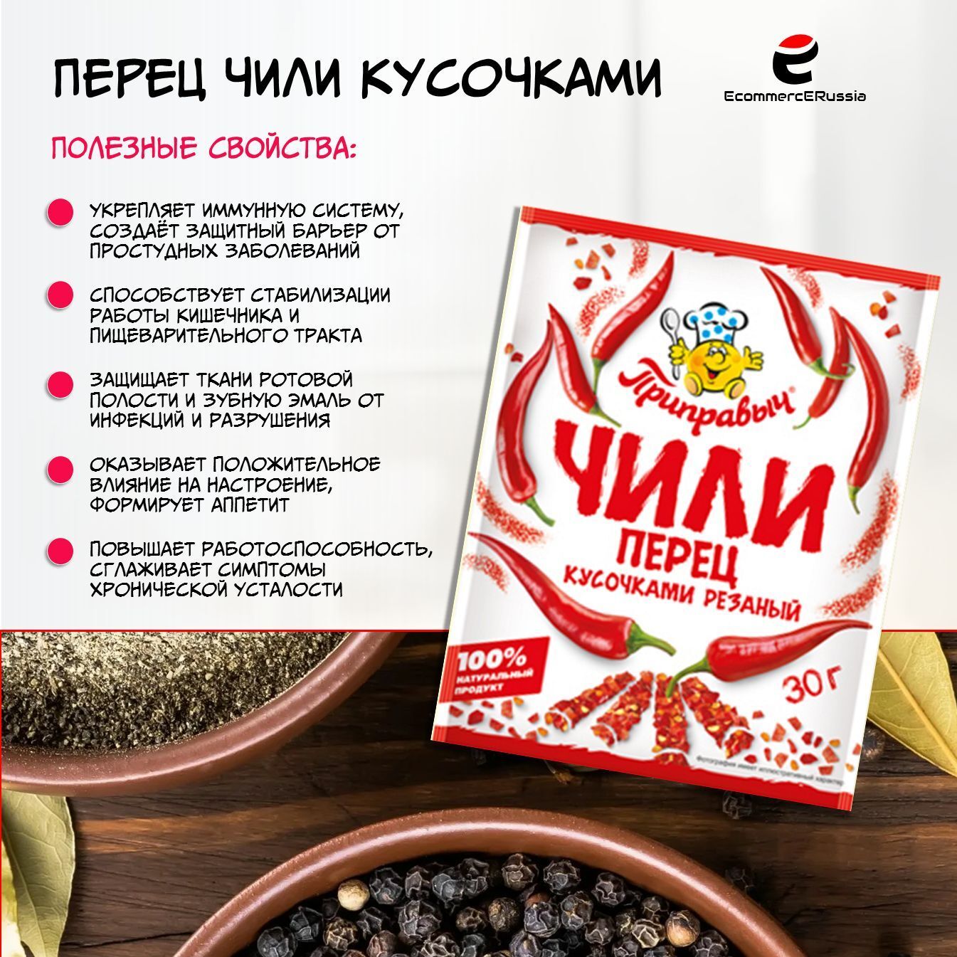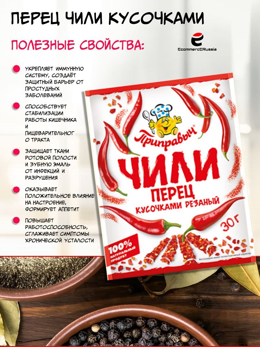 Перец чили в кусочках от бренда Приправыч — это идеальное дополнение к вашей кухне, которое добавит изюминку в любое блюдо. Этот острый перец известен своим ярким вкусом и насыщенным ароматом, которые способны преобразить даже самые простые рецепты.