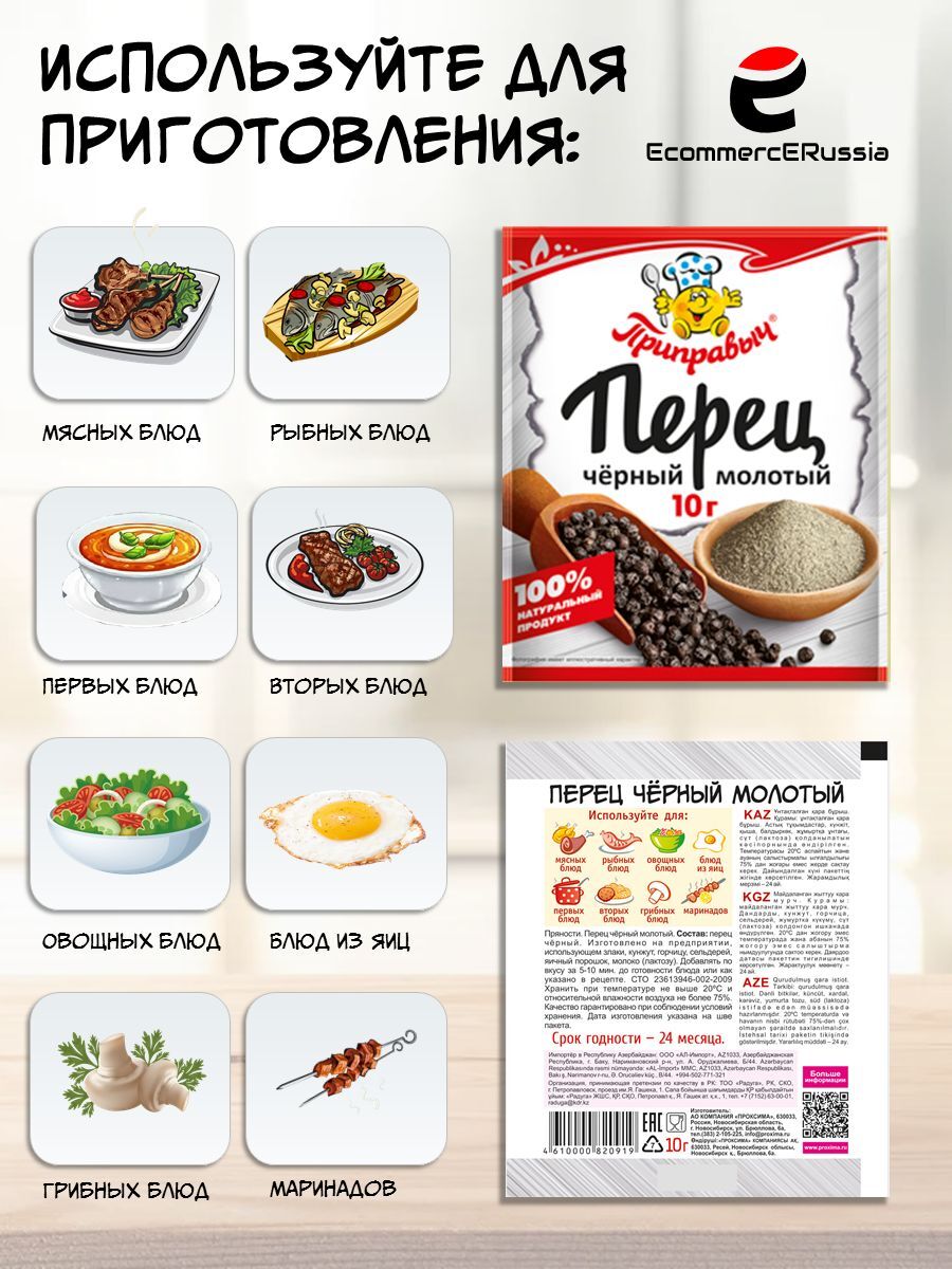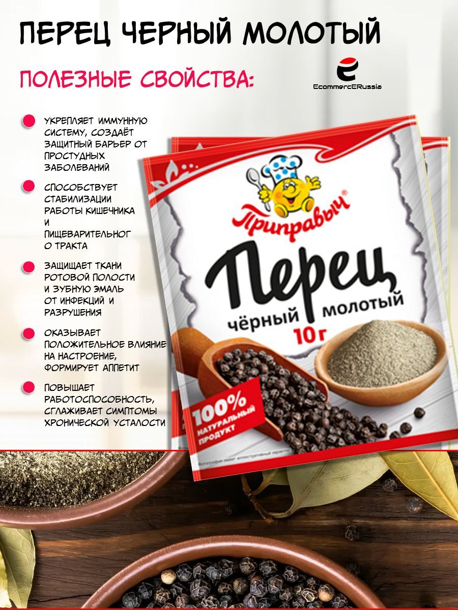 Перец черный молотый от бренда Приправыч — это высококачественная пряность, которая станет незаменимым ингредиентом в вашей кухне. Этот продукт, упакованный в удобные 10 граммов, идеально подходит для придания блюдам насыщенного аромата и пикантного вкуса. Черный перец — одна из самых популярных специй и приправ, используемая во множестве кулинарных традиций по всему миру.