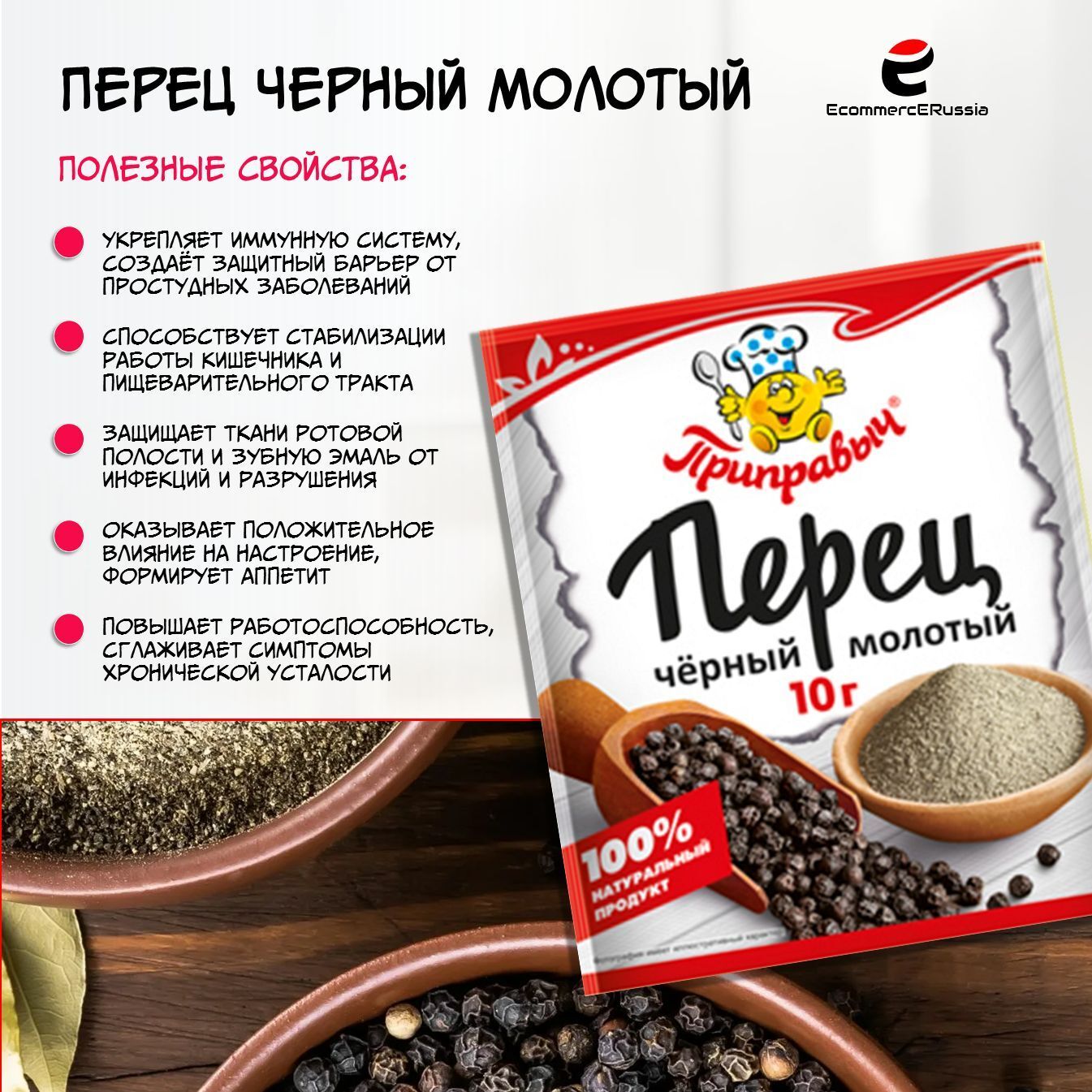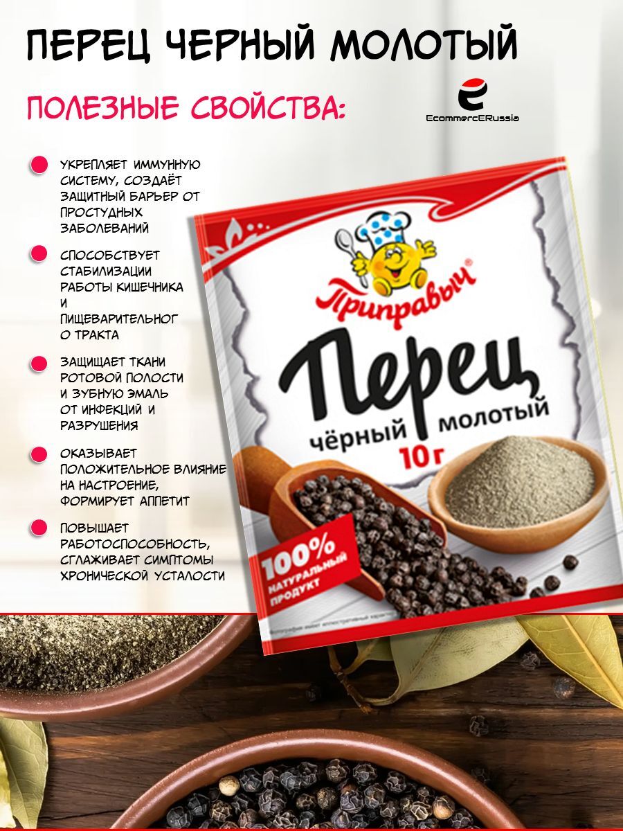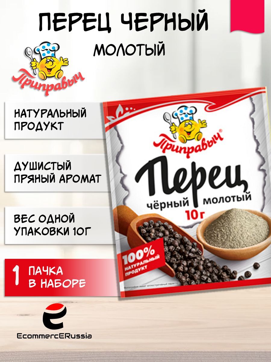 Перец черный молотый от бренда Приправыч — это высококачественная пряность, которая станет незаменимым ингредиентом в вашей кухне. Этот продукт, упакованный в удобные 10 граммов, идеально подходит для придания блюдам насыщенного аромата и пикантного вкуса. Черный перец — одна из самых популярных специй и приправ, используемая во множестве кулинарных традиций по всему миру.