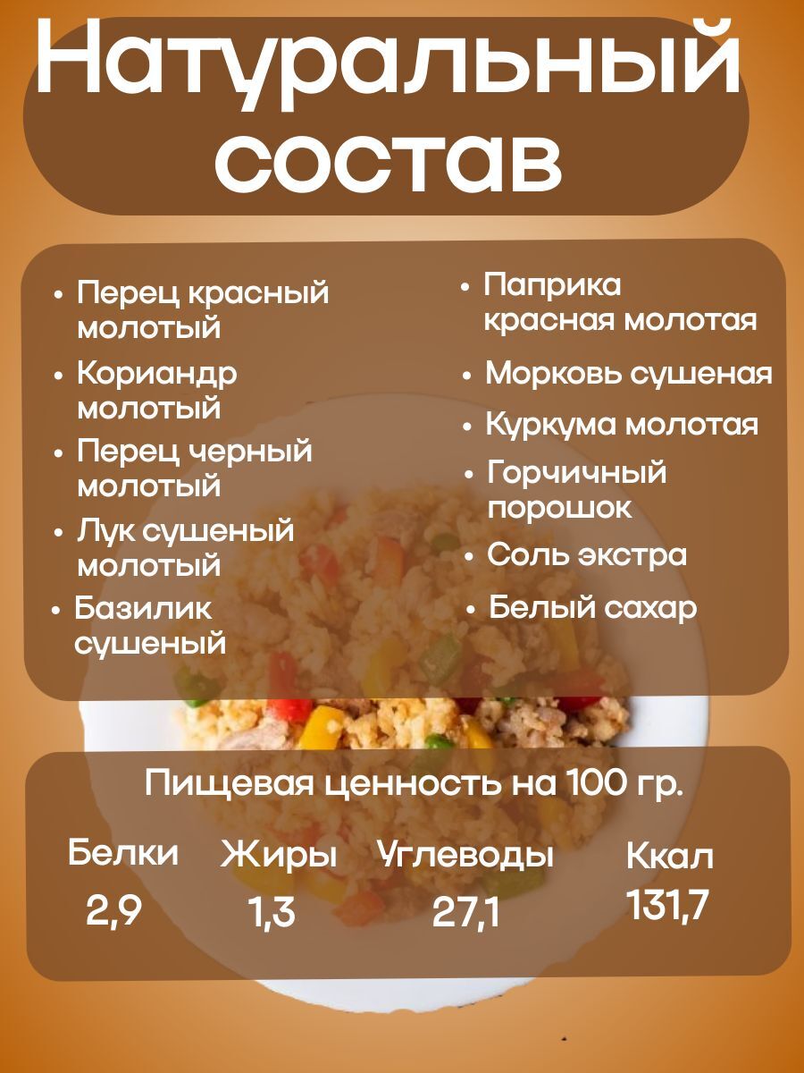 перец красный молотый, кориандр молотый, перец черный молотый, лук сушеный молотый, базилик сушеный, паприка красная молотая, морковь сушеная куркума молотая, соль экста, горчичный порошок, белый сахар.