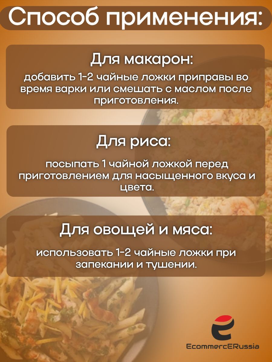 Для макарон – добавить смесь во время варки или смешать с маслом для насыщенного вкуса.