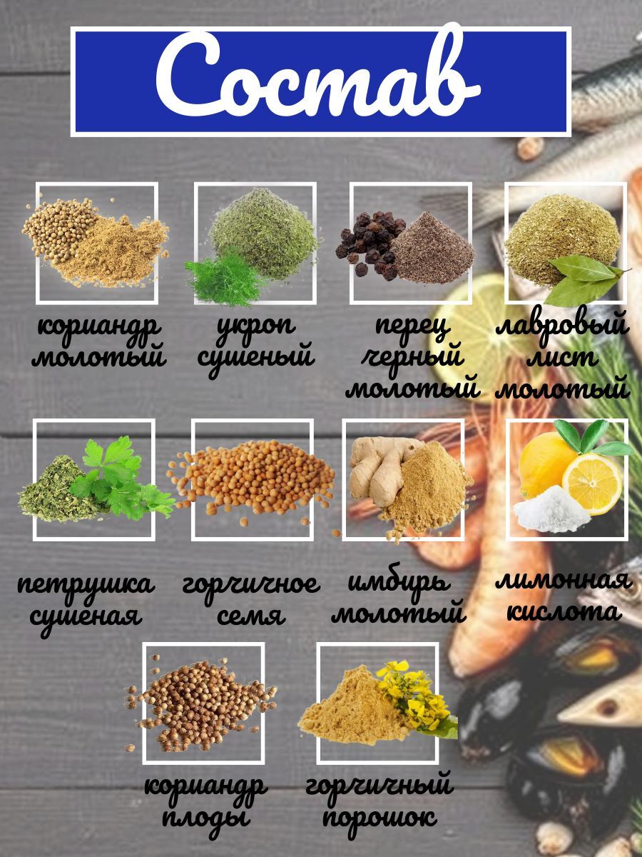 Натуральные ингредиенты – лавровый лист, кориандр, укроп, черный перец, петрушка, горчичный порошок, а также соль и сахар для баланса вкуса.