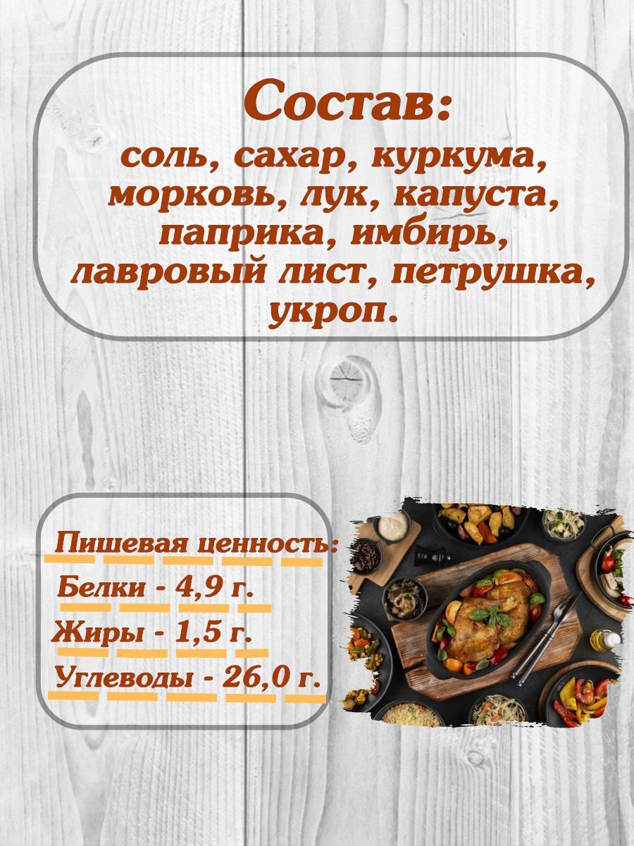 Состав: соль, сахар, куркума, морковь, лук, капуста, паприка, имбирь, лавровый лист, петрушка, укроп. Специи и приправы Relish подходят для разнообразных кулинарных стилей. Будь то традиционная русская кухня, экзотические восточные блюда или легкие средиземноморские рецепты — эта универсальная приправа поможет раскрыть все грани вкуса. Она идеально подходит для запекания, жарки, маринования и даже для приготовления салатов. С Relish вы сможете экспериментировать и видеть, как каждое ваше блюдо становится особенным.