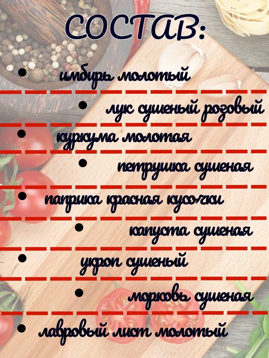 Имбирь молотый, лук сушеный розовый, куркума молотая, петрушка сушеная, паприка красная кусочки, капуста сушеная, сушеная, сахар белый, лавровый лист молотый , соль экстра.
