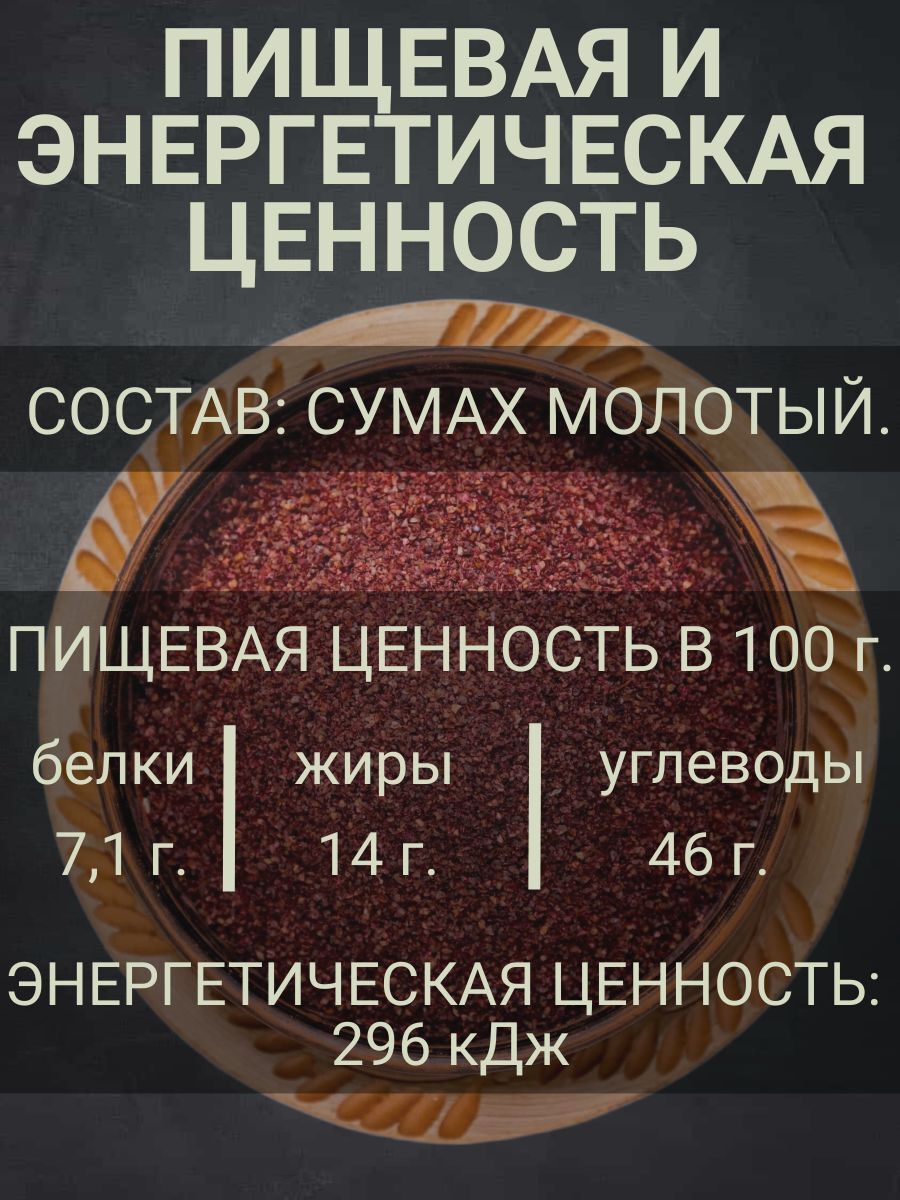 Сумах — это не только вкус, но и здоровье. Он богат антиоксидантами и витаминами, что делает его отличным выбором для тех, кто следит за своим питанием. При этом молотый сумах не содержит искусственных добавок и консервантов, что делает его безопасным для всей семьи.