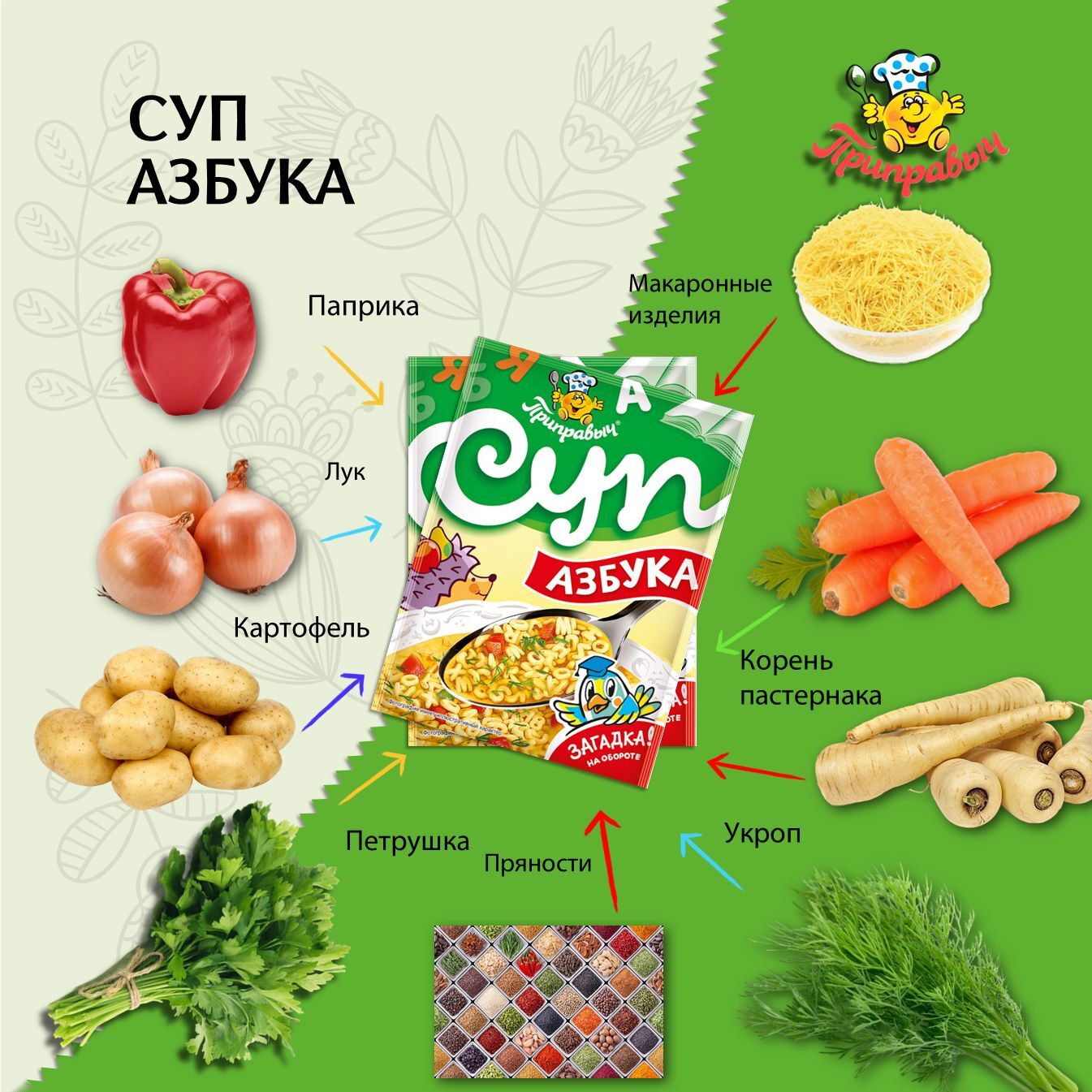 Выбирая наш суповой набор, вы выбираете качество и удобство. Простой в приготовлении и богатый вкусом, этот продукт станет вашим верным спутником на кухне, позволяя вам наслаждаться домашними супами без лишних усилий. Попробуйте супы от Приправыч и убедитесь в их превосходстве сами.