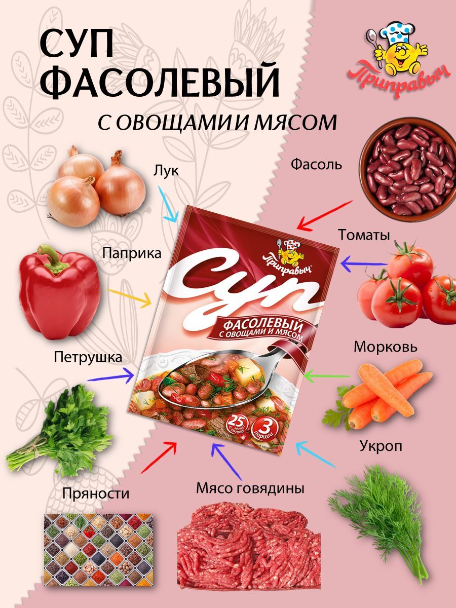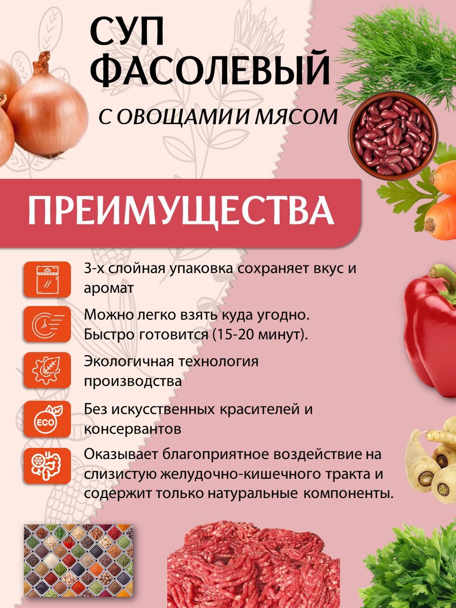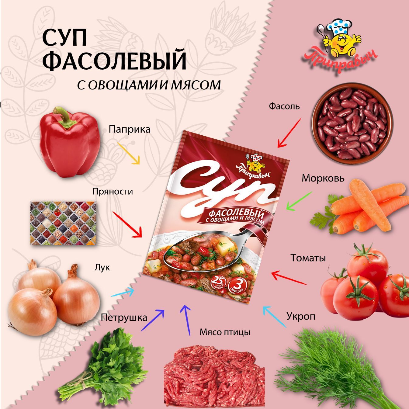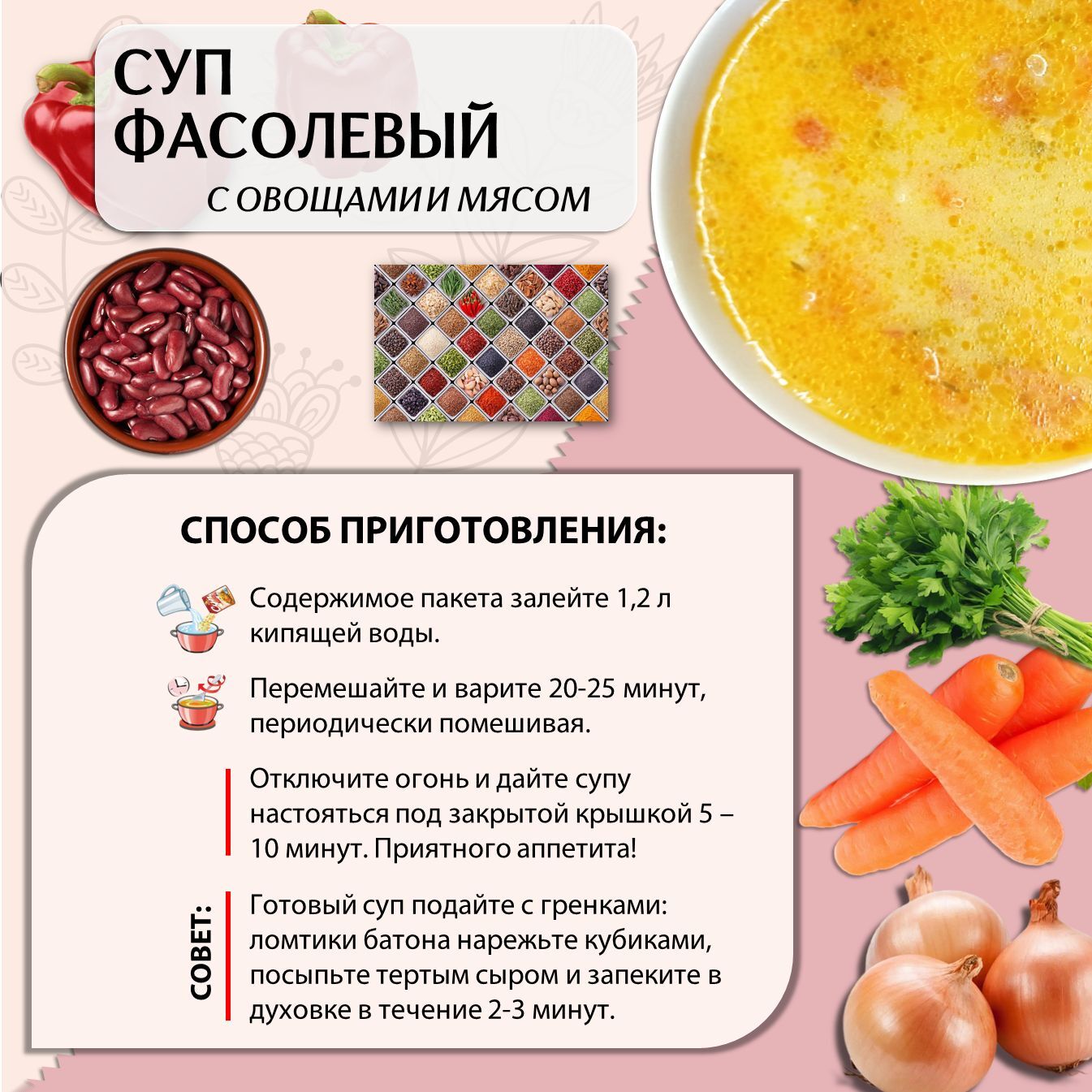 Наш фасолевый суп с мясом и овощами — это не только быстрое, но и вкусное решение для вашего рациона. Супы быстрого приготовления в пакетиках от "Приправыч" пользуются популярностью благодаря своему качеству и разнообразию. Пробуйте, и Вы сами убедитесь, что сухой суп быстрого приготовления может быть не только быстрым, но и очень вкусным.