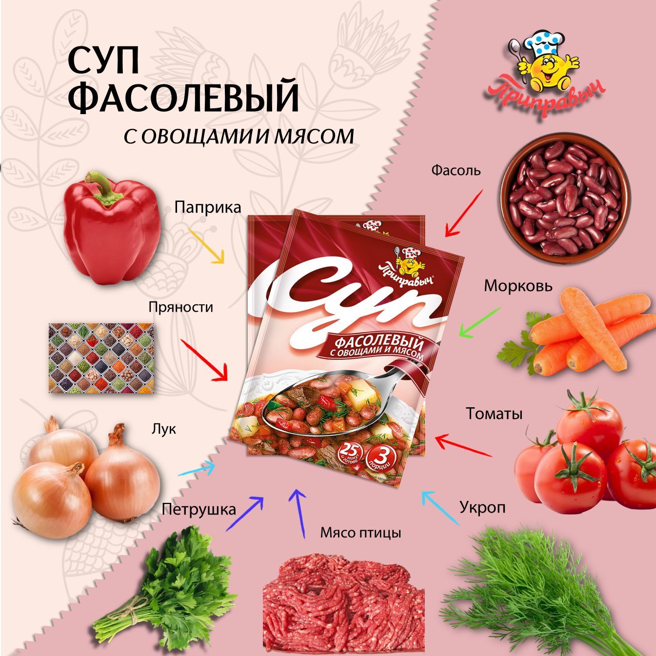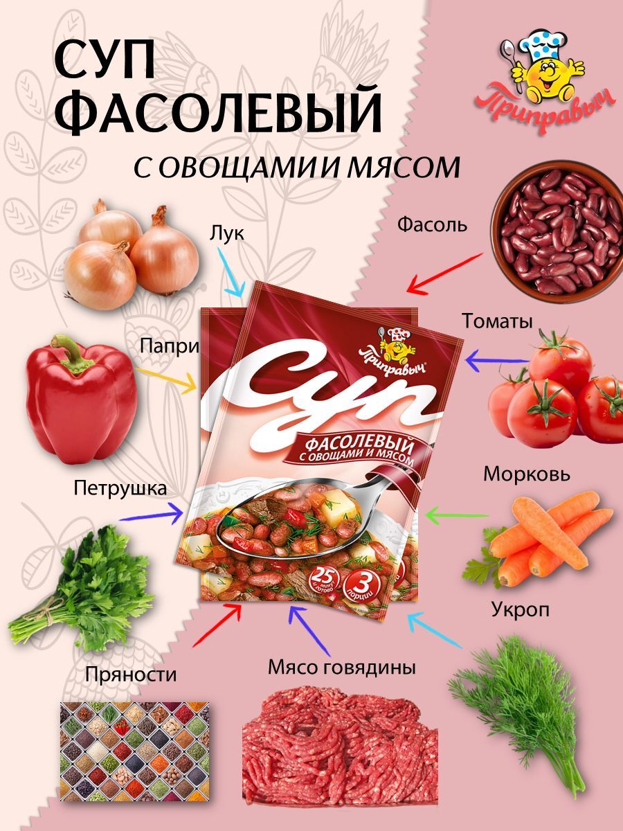 Наш фасолевый суп с мясом и овощами — это не только быстрое, но и вкусное решение для вашего рациона. Супы быстрого приготовления в пакетиках от "Приправыч" пользуются популярностью благодаря своему качеству и разнообразию. Пробуйте, и Вы сами убедитесь, что сухой суп быстрого приготовления может быть не только быстрым, но и очень вкусным.