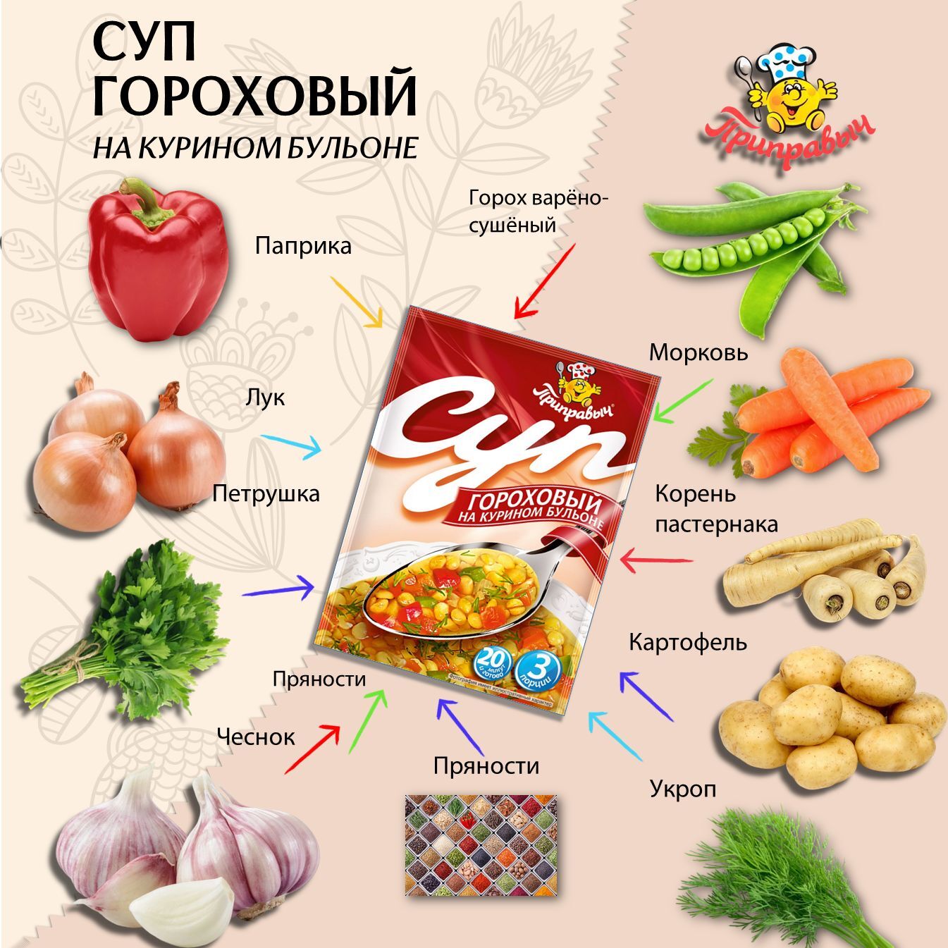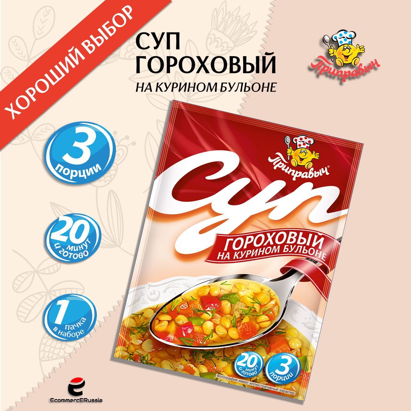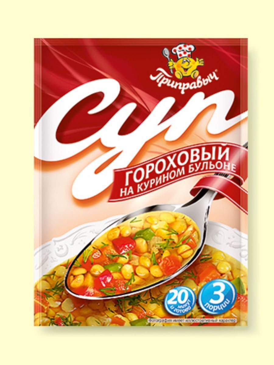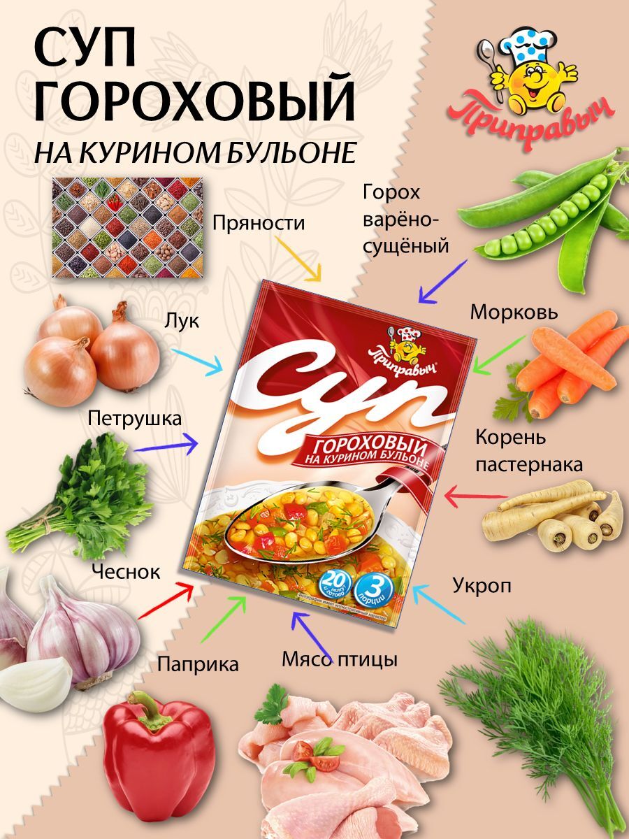 Представляем вашему вниманию гороховый суп на курином бульоне от бренда "Приправыч". Этот продукт станет отличным решением для тех, кто ценит домашний уют и комфорт, но не всегда имеет время на полноценное приготовление обеда или ужина. Суповая смесь удобно упакована в пакетики, что делает процесс приготовления простым и быстрым.