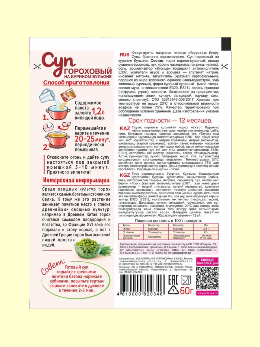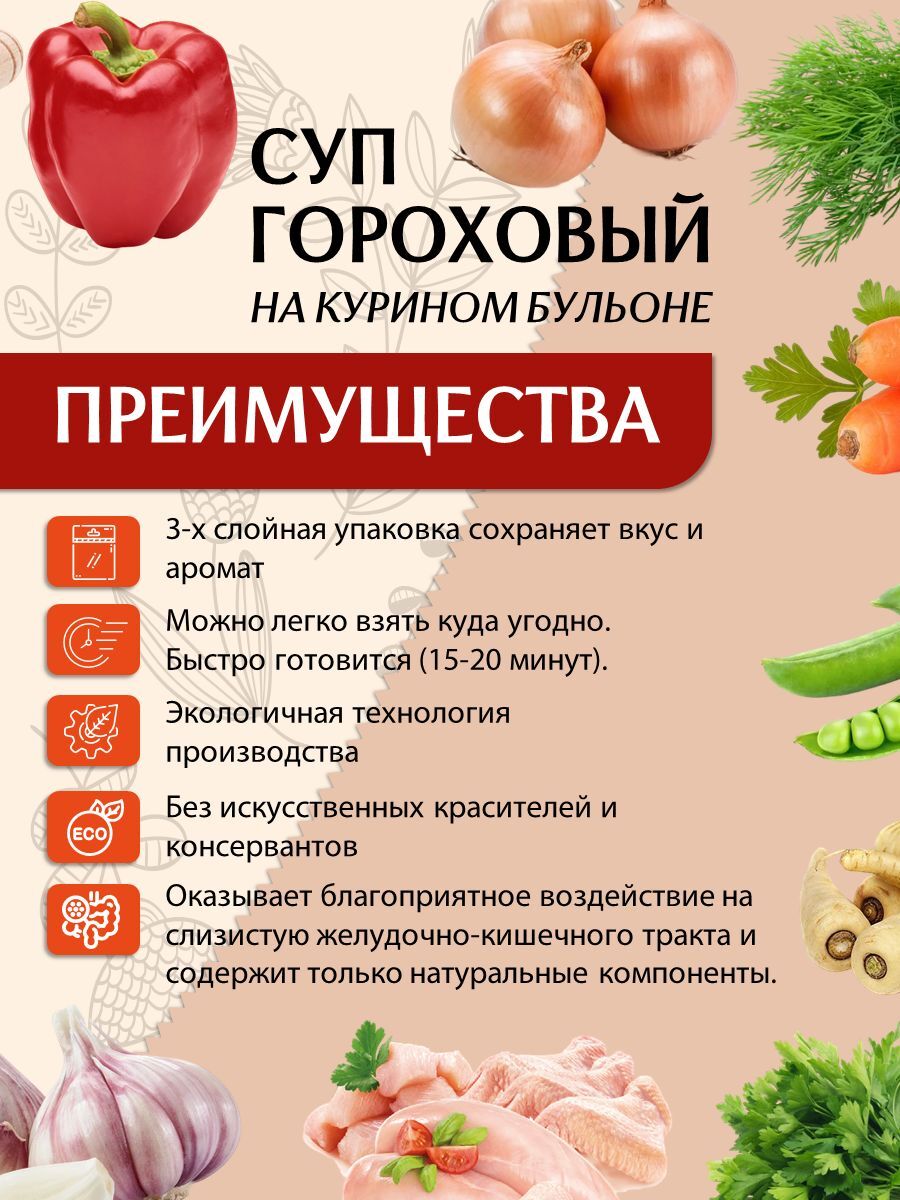 Гороховый суп богат питательными веществами и идеально подходит как для взрослых, так и для детей. Легкая и полезная смесь для супа не содержит искусственных добавок, что делает его отличным выбором для заботливых родителей. Суп быстрого приготовления станет настоящим спасением в дни, когда нет времени на долгое приготовление пищи, но все же хочется порадовать себя и близких чем-то домашним.