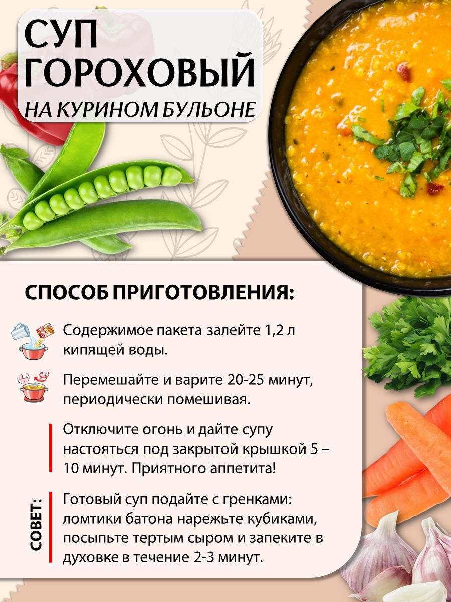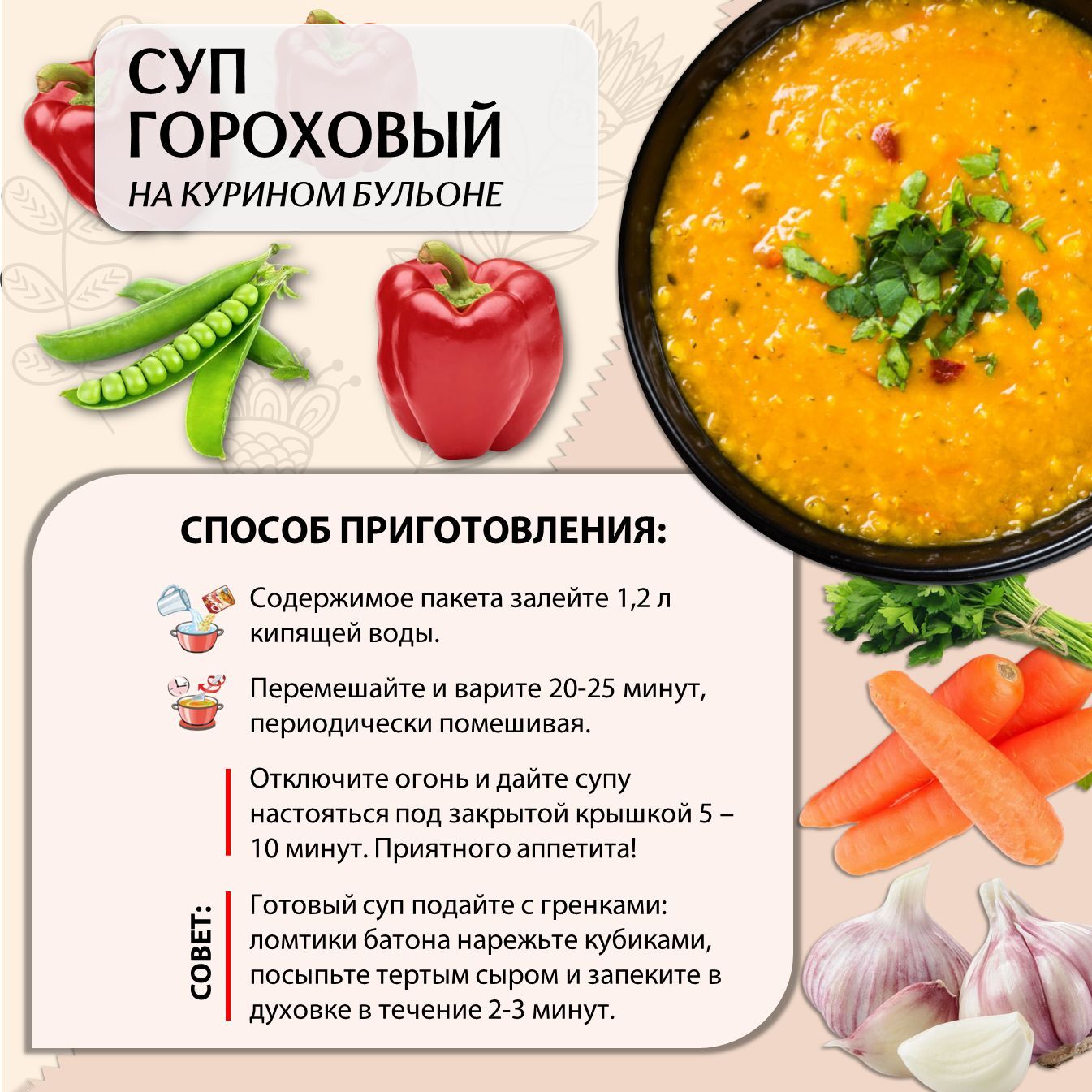 Гороховый суп богат питательными веществами и идеально подходит как для взрослых, так и для детей. Легкая и полезная смесь для супа не содержит искусственных добавок, что делает его отличным выбором для заботливых родителей. Суп быстрого приготовления станет настоящим спасением в дни, когда нет времени на долгое приготовление пищи, но все же хочется порадовать себя и близких чем-то домашним.