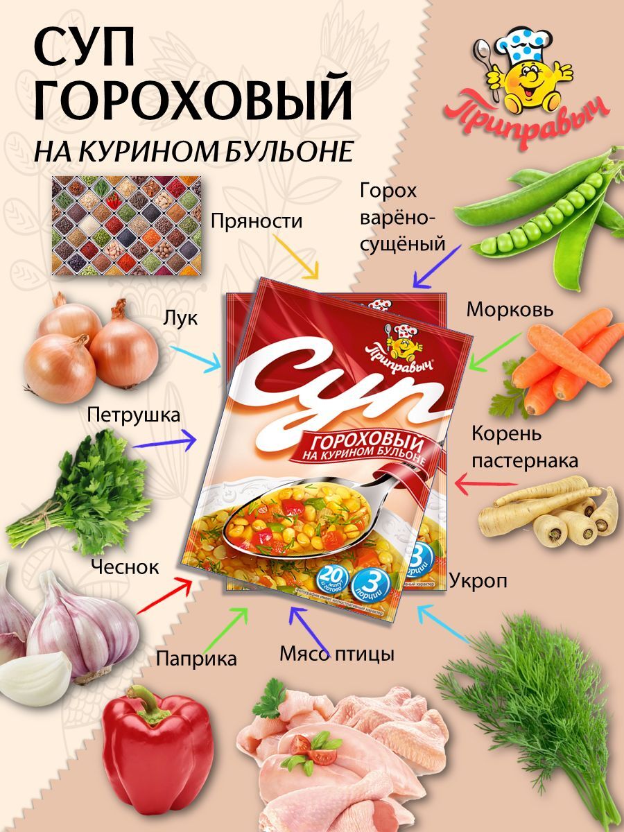 Представляем вашему вниманию гороховый суп на курином бульоне от бренда "Приправыч". Этот продукт станет отличным решением для тех, кто ценит домашний уют и комфорт, но не всегда имеет время на полноценное приготовление обеда или ужина. Суповая смесь удобно упакована в пакетики, что делает процесс приготовления простым и быстрым.