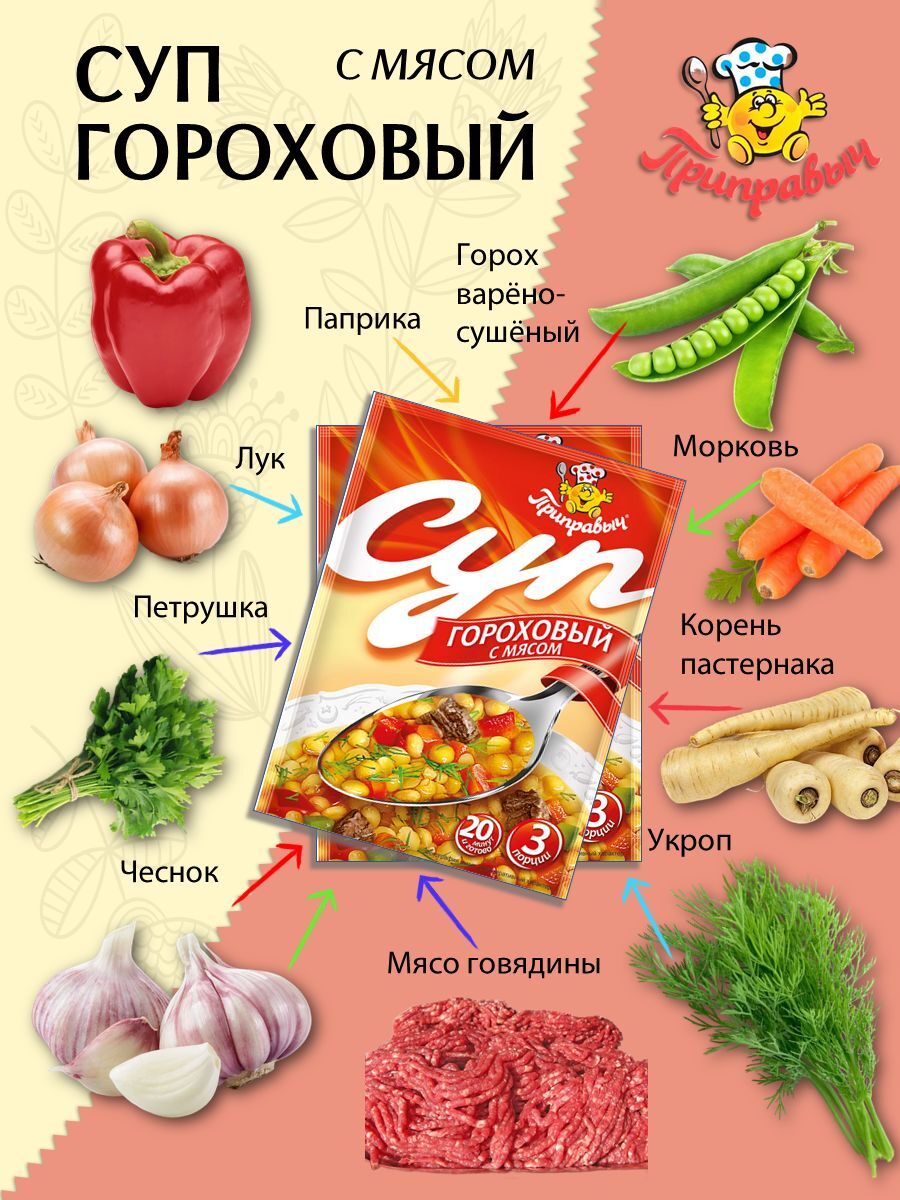 Не упустите возможность попробовать гороховый суп, который не только порадует вас своим вкусом, но и станет вашим надежным помощником в приготовлении быстрых и вкусных блюд. Наслаждайтесь качеством и простотой с супами "Приправыч" – это ваш идеальный выбор для ежедневного рациона.
