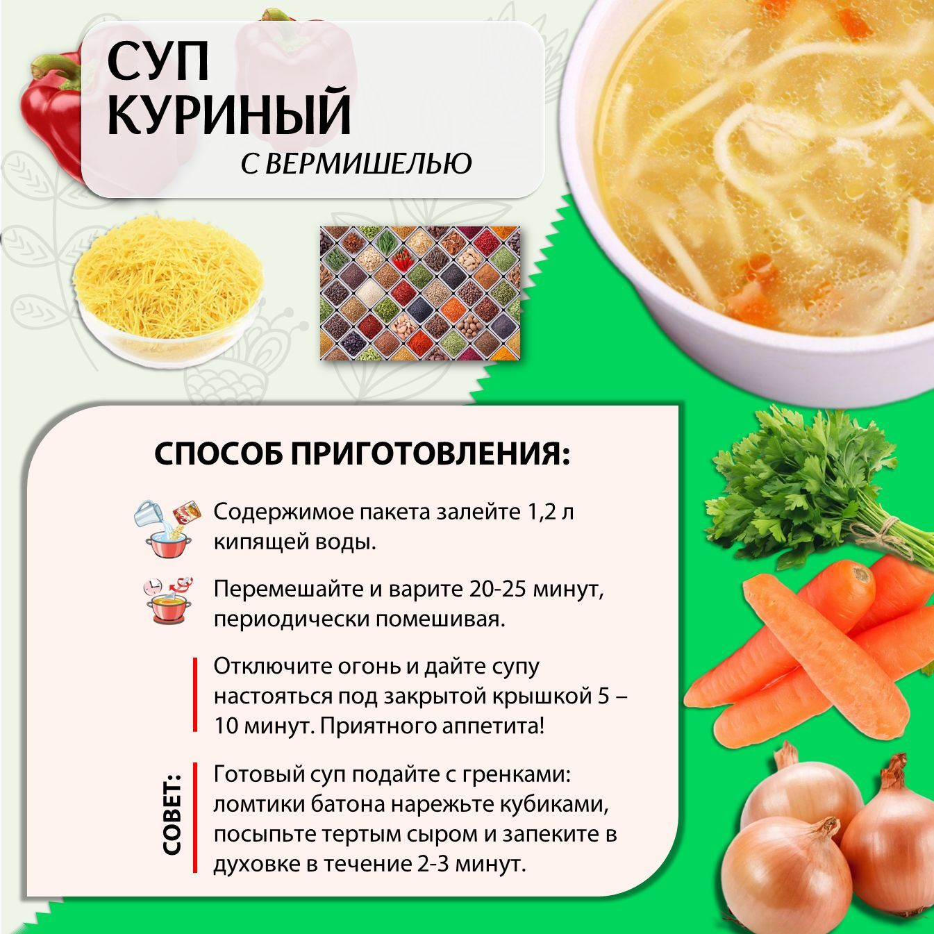 Набор для супа "Приправыч" — это не просто супы в пакетиках быстрого приготовления, это возможность насладиться горячим блюдом в любое время и в любом месте. Приготовление требует минимальных усилий и ваш вкусный, готовый суп уже на столе. Суп с вермишелью станет отличным дополнением к вашему обеду или ужину, а также идеальным вариантом для перекуса.