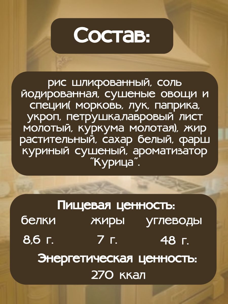 рис шлифованный, соль йодированная, сушеные овощи и специи( морковь, лук, паприка, укроп, петрушка,лавровый лист молотый, куркума молотая), жир растительный, сахар белый, фарш куриный сушеный, ароматизатор "Курица".