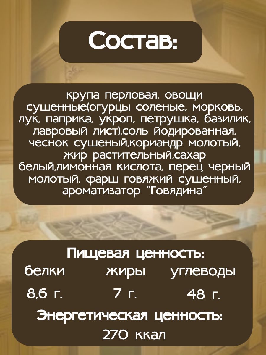 крупа перловая, овощи сушенные(огурцы соленые, морковь, лук, паприка, укроп, петрушка, базилик, лавровый лист),соль йодированная, чеснок сушеный,кориандр молотый, жир растительный,сахар белый,лимонная кислота, перец черный молотый, фарш говяжий сушенный, ароматизатор "Говядина"