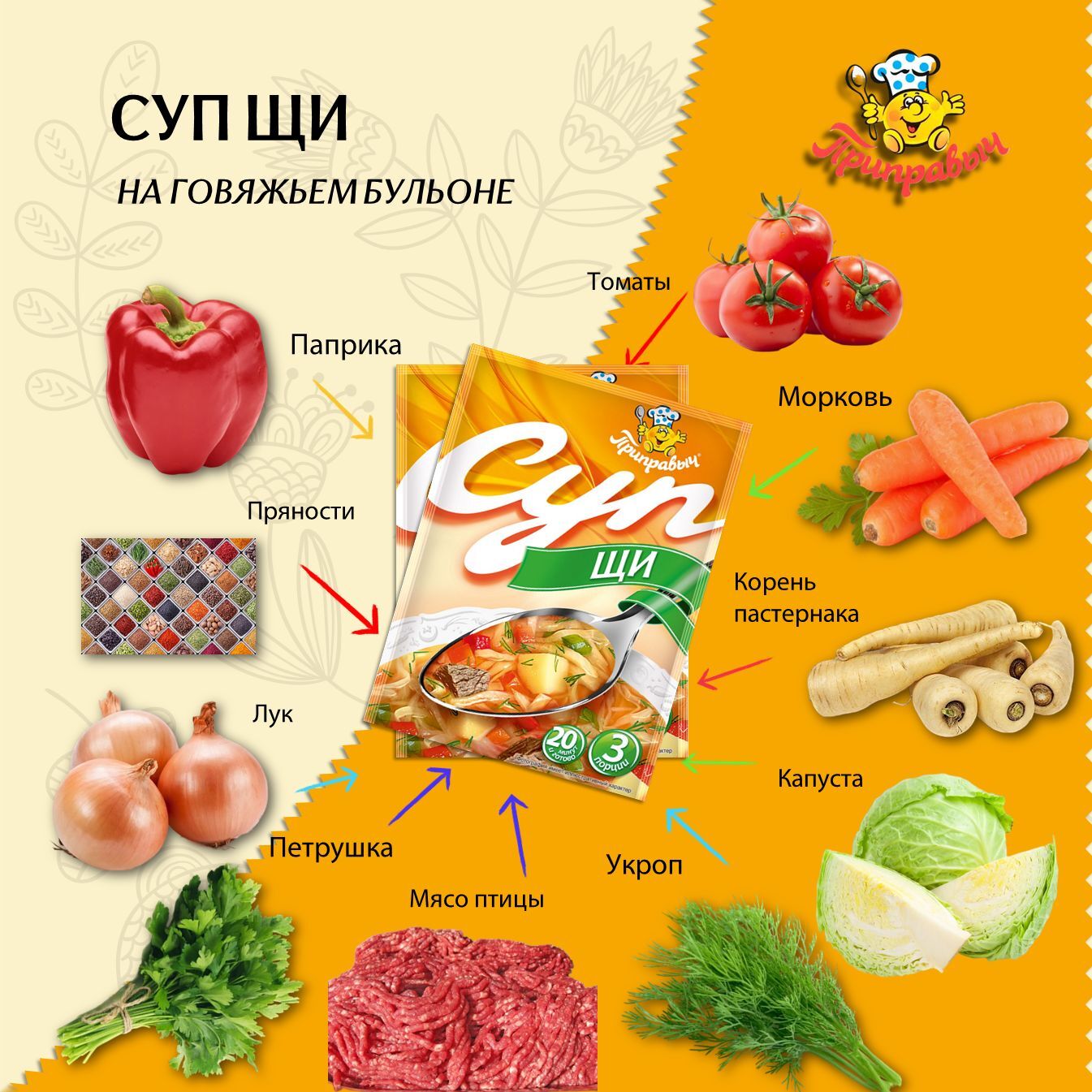 Представляем Вашему вниманию идеальное решение для любителей вкусной и сытной еды в походных условиях – продукт, который станет надежным спутником в путешествиях и на даче. Эта смесь для приготовления супа Суп "Щи" на говяжьем бульоне "Приправыч" - представляет собой уникальную заправку, состоящую из тщательно подобранных сушеных овощей и пряностей, которые идеально сочетаются друг с другом.