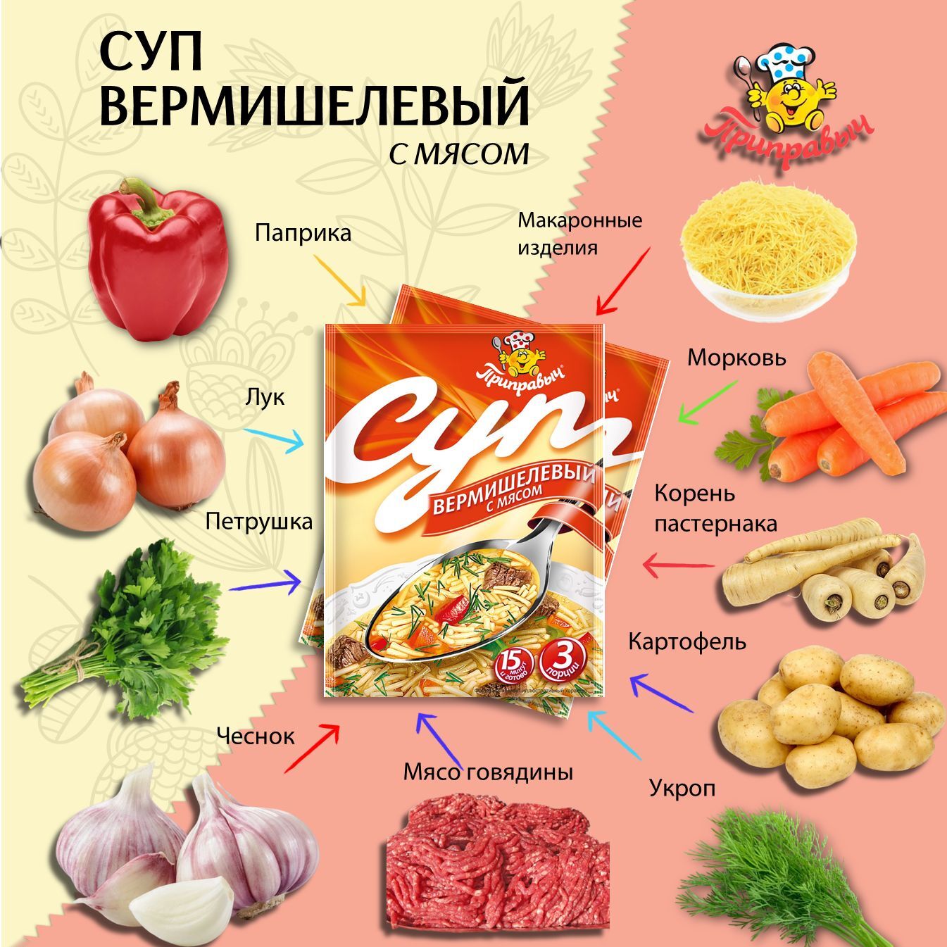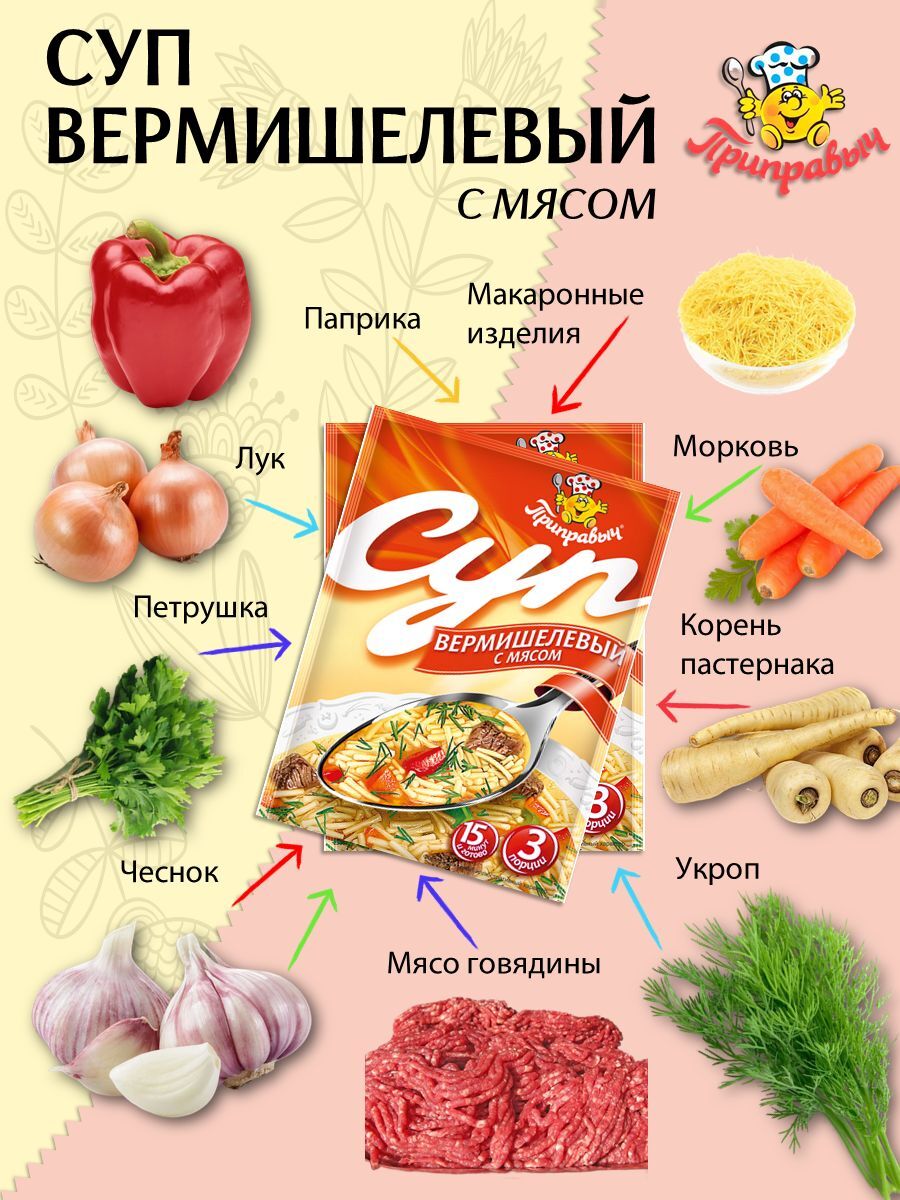 Представляем вашему вниманию суп с вермишелью от бренда Приправыч — идеальное решение для быстрого и вкусного обеда. Наш суп в пакетиках быстрого приготовления сочетает в себе все необходимые ингредиенты, чтобы вы могли насладиться ароматным и питательным блюдом всего за несколько минут.